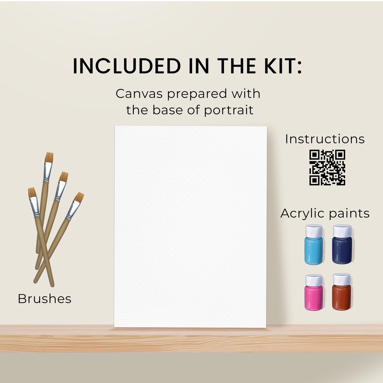 Upload a clear picture, and we’ll prepare a custom canvas with your portrait sketched as the base. Your kit includes: Personalized canvas with your portrait, 4 acrylic paints, 4 Brushes, Easy-to-follow instructions